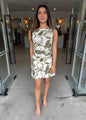 The Dahlia Mesh Mini Dress is made from a stretch jersey in our exclusive Dahlia print. The silhouette is fitted through the body, with a slight A-line shape at hem and mini in length. Features include a wide boat neckline and soft gathering through the waist. This dress is fully lined.