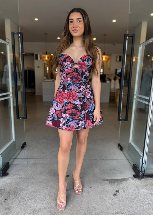 Though the jacquard fabric has no stretch, the expertly tailored construction ensures a smooth, secure fit. Whether you’re heading to a party, celebration, or special dinner, the Delphine Mini is a floral-forward piece that captures attention.