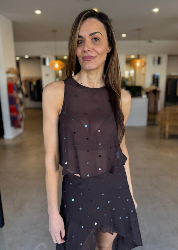 Styled with our Arielle Asym Skirt in Dark Choc Sequin