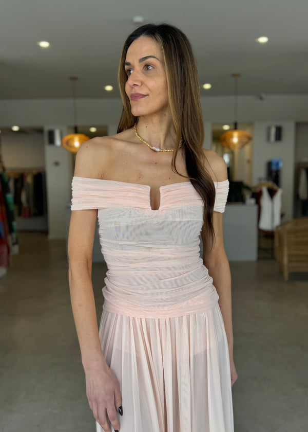 Camille Off Shoulder Top in Peach. This delicate off-shoulder top, crafted from soft mesh, features a captivating sheer design, perfect for an effortless and feminine look.