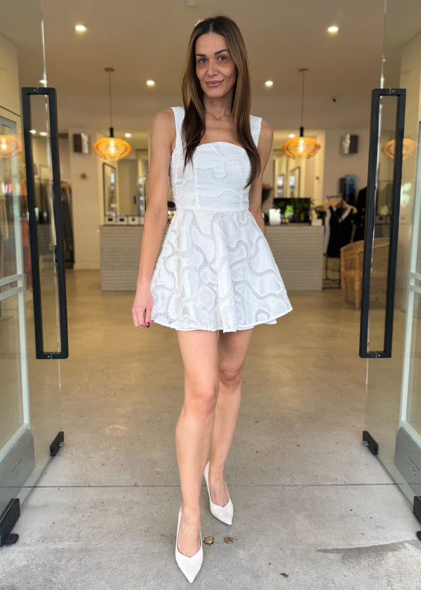 The Elara Beaded Mini Dress in White embodies modern sophistication with a touch of elegance. Designed in a timeless mini fit and flare dress silhouette, this dress accentuates the waist and flows effortlessly into a flattering flared skirt. Perfect for any occasion, whether a cocktail event, brunch, or date night, the Elara dress is an essential addition to your wardrobe.