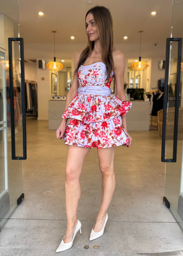 Crafted from a vibrant printed satin fabrication, the dress showcases a curved neckline and a fitted bodice detailed with delicate tucks to enhance your shape. The detachable and adjustable straps give you the option to wear it strapless or with added support — perfect for adapting your look. A wide belt tie at the waist adds definition and flatters your figure, while the tiered circle-cut skirt brings movement and volume to every step.