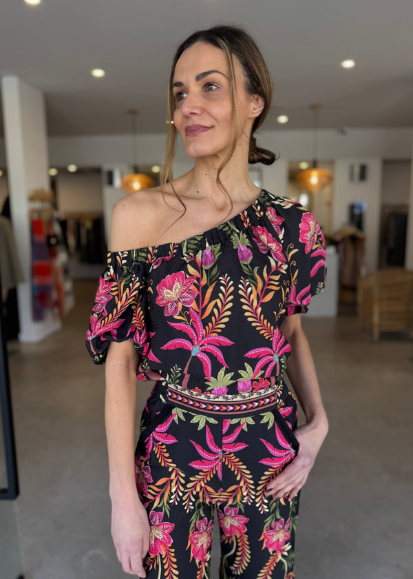 The asymmetrical neckline draws the eye, balanced by a voluminous puff sleeve on one side for dramatic flair. The Anthos Lótos floral placement print — in bold pinks, greens, and citrus on a deep base — evokes the feel of a faraway resort escape. Subtle gathers along the neckline create a soft drape, while the silhouette pairs effortlessly with high-waisted skirts or pants for relaxed polish.