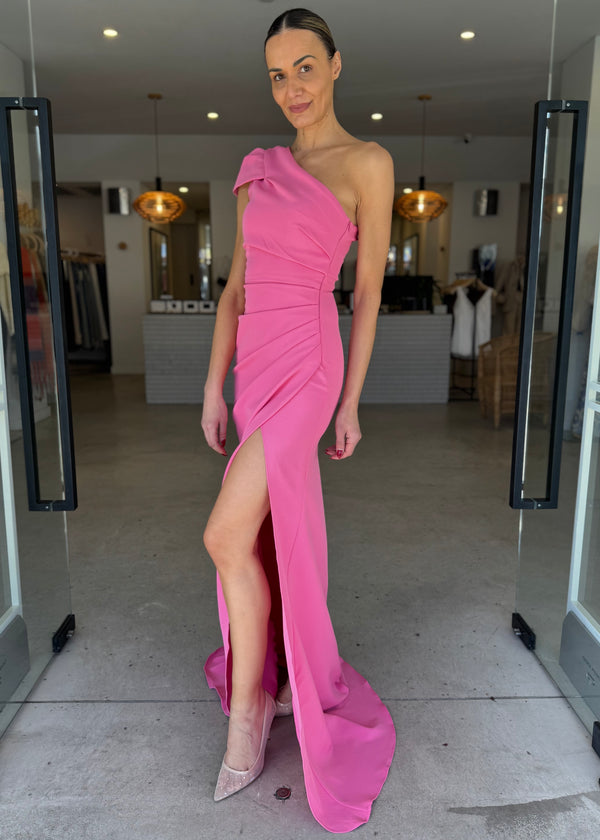 Pair it with strappy heels, soft waves, and delicate jewellery for a look that feels both strong and romantic. The Klara One Shoulder Gown in Pink is an ideal statement piece for when you want to turn heads with sophistication and style.