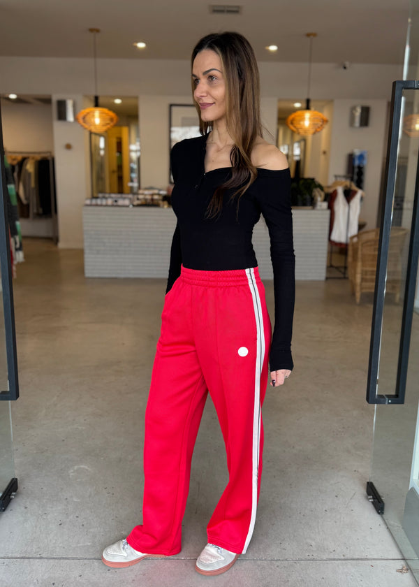 The Tricot Trackpant in Strawberry is designed in midweight Tricot fabric and features an elasticated waistband, side pockets and a contrast taping down the side panel.