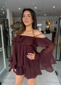 Tiered ruffle top in umber in a textured sheer crinkle fabrication.