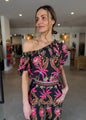 The asymmetrical neckline draws the eye, balanced by a voluminous puff sleeve on one side for dramatic flair. The Anthos Lótos floral placement print — in bold pinks, greens, and citrus on a deep base — evokes the feel of a faraway resort escape. Subtle gathers along the neckline create a soft drape, while the silhouette pairs effortlessly with high-waisted skirts or pants for relaxed polish.