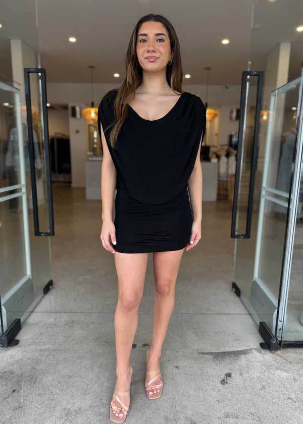 Introducing our Flora mini dress - designed in a soft stretch fabric, it features a draped cowl neckline and a matching low back detail that exudes subtle sophistication. Ruching throughout the body creates a flattering, form-fitting silhouette, making it your go-to for elevated evenings and statement moments.