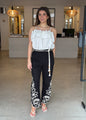 Featuring striking contrast floral embroidery along the lower legs, each detail is meticulously placed to elongate and flatter the silhouette. A softly tailored fit with a high-rise waist ensures all-day comfort, while the addition of a drawstring rope belt with tassel accents lends a playful, artisanal touch.