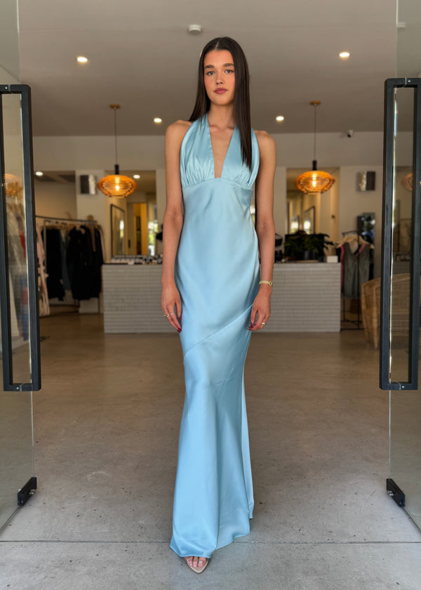 The Novia Dress crafted from luxe satin, features a sexy plunge V neckline with delicate ruching under the bust. The elegant soft mermaid skirt skims the hips and flatters the body. The halter sash fastens at the back neck, and hangs, showcasing the bare back.